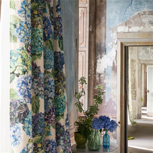 Här har man satsat på en relativt diskret tapet och isället satt färgen på draperi, fåtöj och lampskärm och man har även förstärkt färgerna man valt med blommorna!
