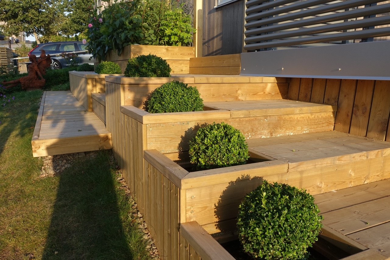 Jag har också buxbomsklot i ”trappstegen” på min terrass på framsidan. Det blir en sådan vacker kontrast till allt det ”kantiga” med dessa runda buxbomsklot. Buxbom är väldigt vackert hela året, och en av anledningarna till att jag tycker så mycket om buxbom är att den är städsegrön vilket innebär att den inte tappar sina blad och är grön året om och det gör trädgården levande även på vintern. När jag planerade min trädgård ville jag få in delar som just är gröna hela året. Det är också därför jag gjort en vägg av murgröna som också är en växt som är grön året om.