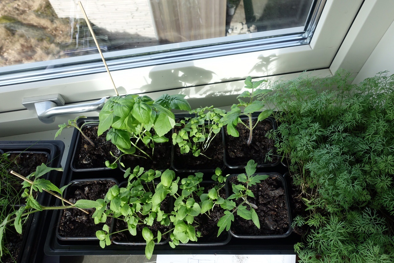 Sedan har jag en mängd kryddor i olika stadier som jag satt. Allt för att jag skall kunna använda efter hand! Ni ser den fina basilikan som nästan är klar för användning och sedan ser ni några små som jag satt lite senare av detta skäl. Även tomater och olika sorters dill!