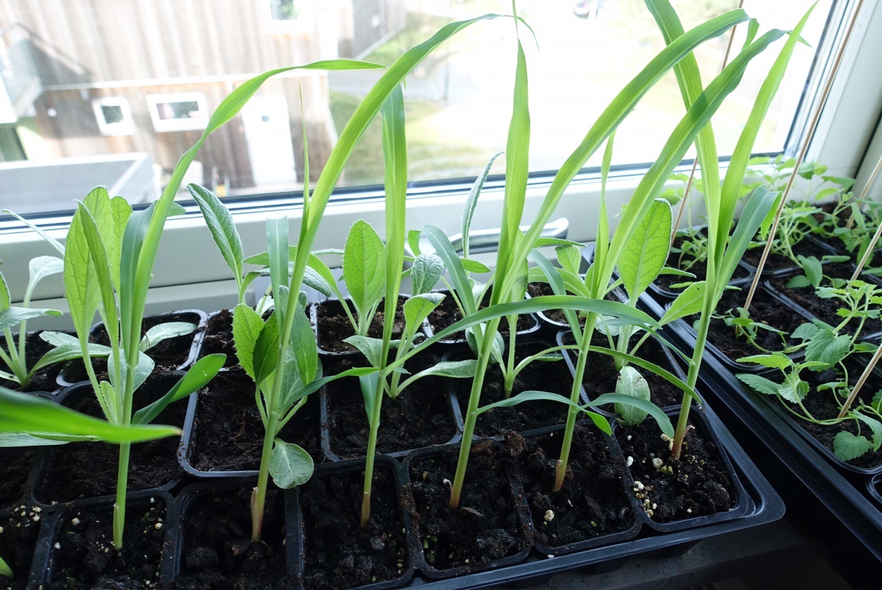 Sedan har vi mina vackra majsplantor, det är både mini-majs och vanlig majs. En vanlig majplanta kanske ger 4 majskolvar och en minimajsplanta ger ca 15 små majskolvar och kan även användas att torka och göra popcorn av…hahaha jag kommer alltså bli självförsörjande på popcorn? Vad tror ni om det! 🙂 hihihihih nä jag skall ha dom att woka och äta i sallader har jag tänkt.